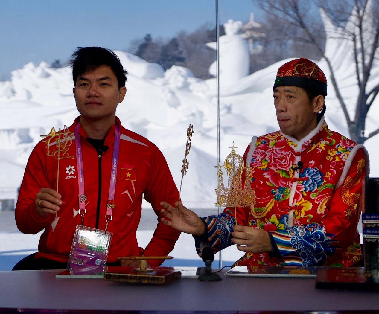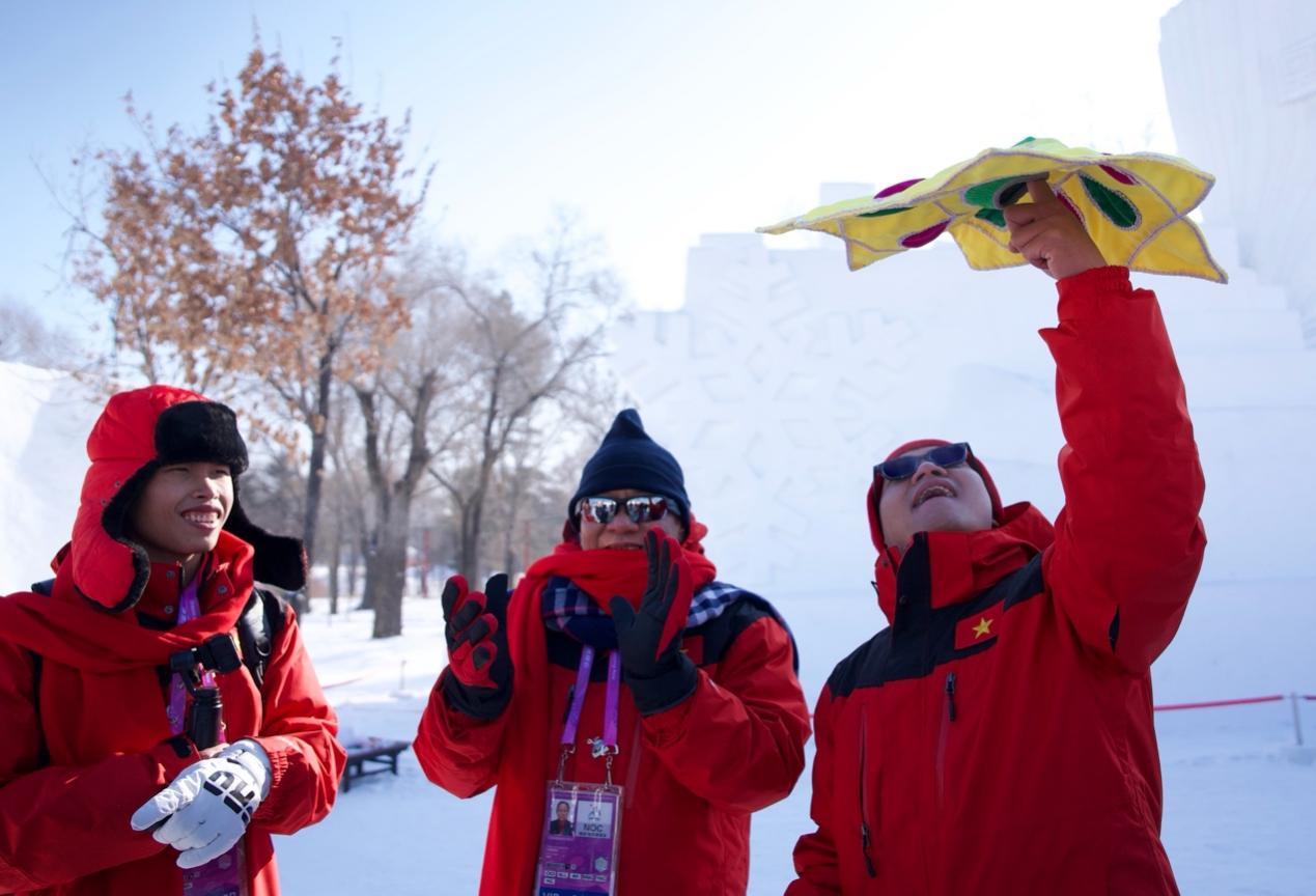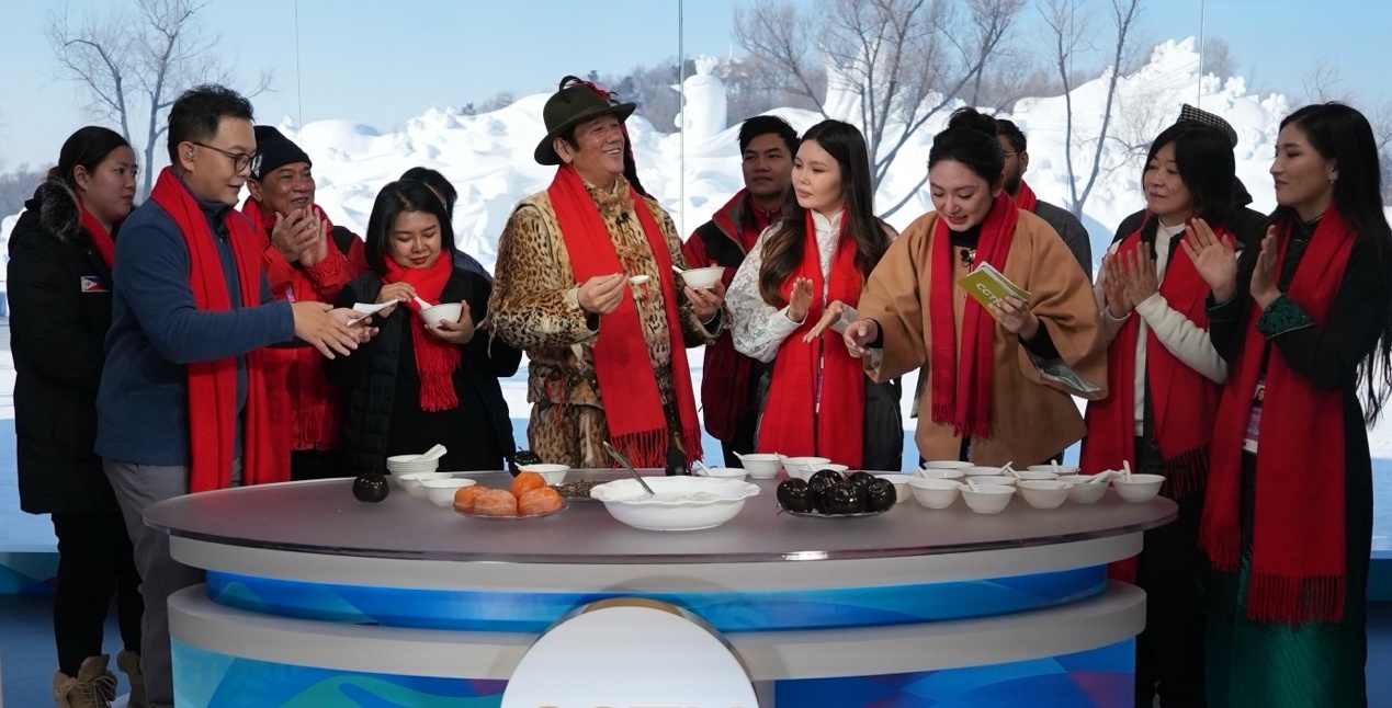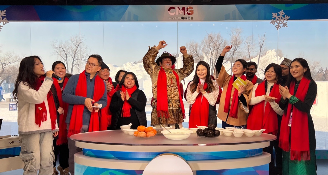 來自蒙古國、泰國、菲律賓、越南、印度、尼泊爾等國的近20位運(yùn)動員、體育代表團(tuán)官員和媒體人,在賽場上比拼之后,歡聚在哈爾濱太陽島雪博會中央廣播電視總臺的演播室,在冰天雪地中共慶新春。