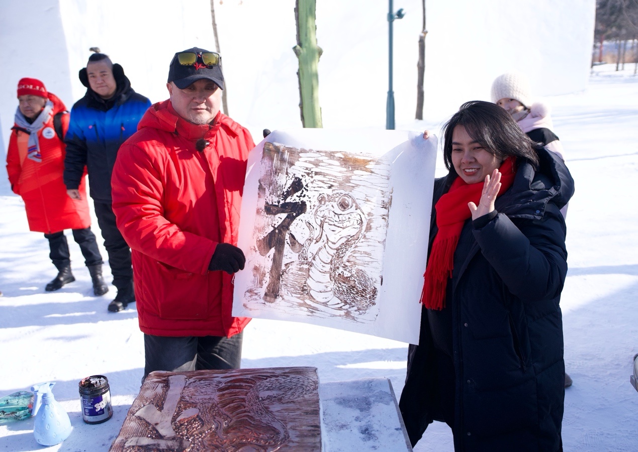 泰國駐華大使館二等秘書王安安在黑龍江省藝術(shù)研究院冰版畫研究院副院長盛琰的指導(dǎo)下,制作出冰版畫《畫蛇添福》,用蛇的形狀和漢字的偏旁部首組合雕刻出漢字“?!辈⑼赜〕鰜恚耐袑χ袊r(nóng)歷蛇年的祝福。
