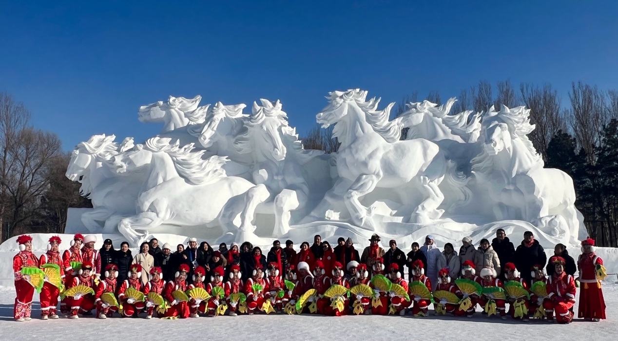 參加活動的中外友人在雪博會雪雕作品《八駿踏雪》前合影