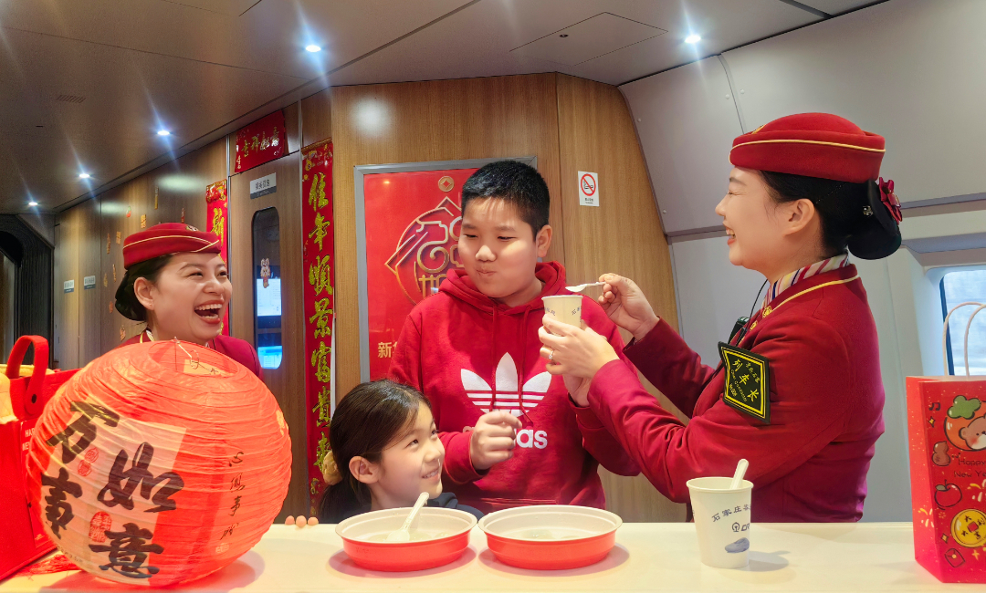 在高鐵列車上吃湯圓很甜,但更甜的是大家的笑臉。