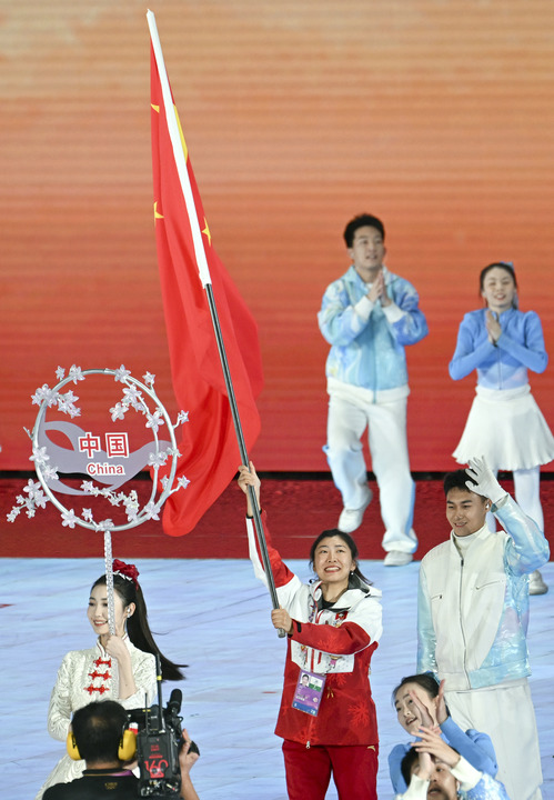 自由式滑雪運(yùn)動(dòng)員徐夢(mèng)桃擔(dān)任中國(guó)代表團(tuán)的旗手。35歲的她,是中國(guó)雪上項(xiàng)目的傳奇人物,實(shí)現(xiàn)了冬奧會(huì)、世錦賽、世界杯等多項(xiàng)大賽的大滿貫,成為中國(guó)雪上項(xiàng)目首位實(shí)現(xiàn)“全滿貫”的運(yùn)動(dòng)員。在本屆亞冬會(huì)上,她以 90.94 分的成績(jī)奪得女子空中技巧金牌,還帶領(lǐng)團(tuán)隊(duì)在多個(gè)項(xiàng)目中斬獲佳績(jī)。她堅(jiān)韌不拔的精神和卓越的競(jìng)技表現(xiàn),正是中國(guó)冰雪運(yùn)動(dòng)員的代表。