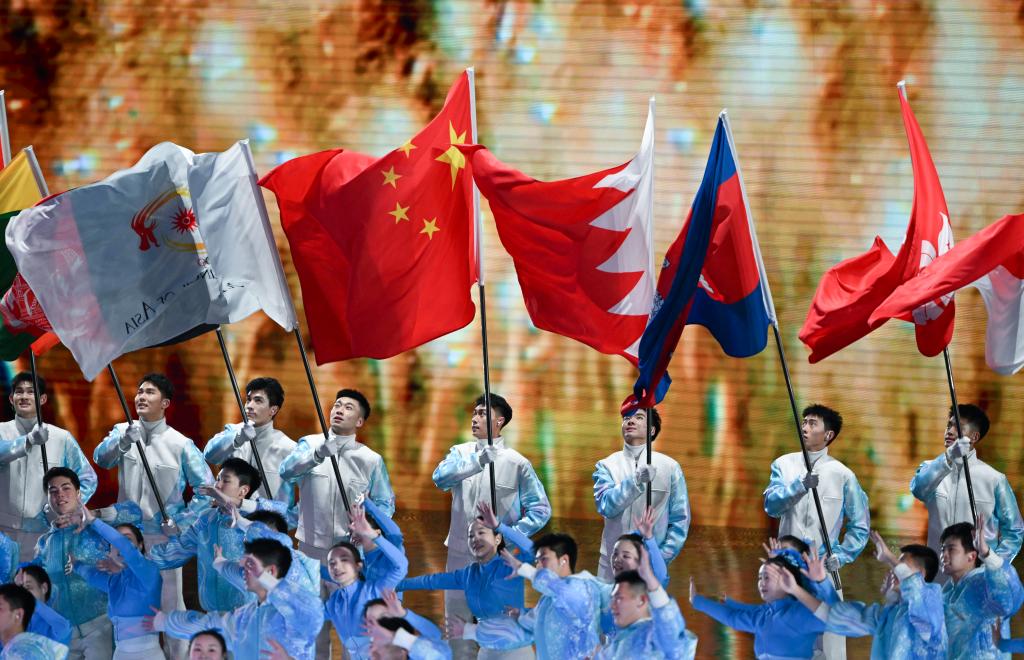 這是2月14日拍攝的各體育代表團(tuán)入場環(huán)節(jié)。當(dāng)日,第九屆亞洲冬季運動會閉幕式在哈爾濱舉行。新華社記者 黃博涵 攝