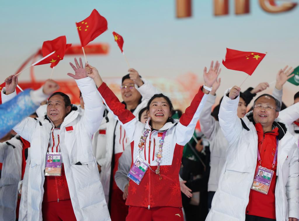 2月14日,中國體育代表團旗手徐夢桃(中)在亞冬會閉幕式上。新華社記者 張濤 攝