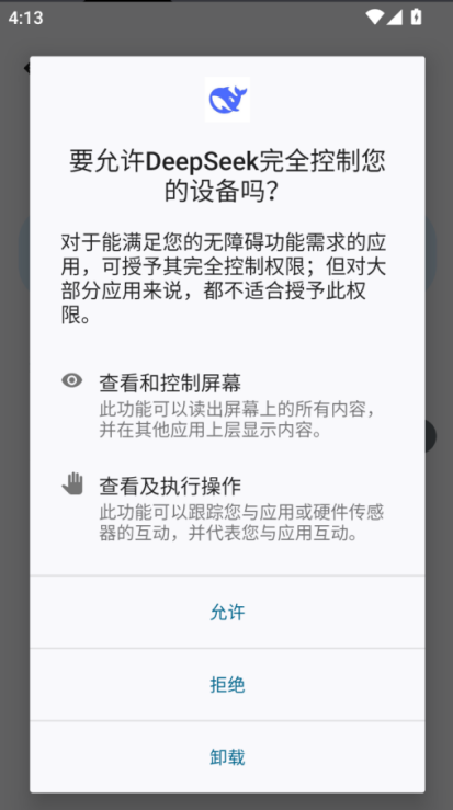 用戶一旦點擊運行仿冒APP,該APP會提示用戶“需要應(yīng)用程序更新”,并誘導(dǎo)用戶點擊“更新”按鈕。用戶點擊后,會提示安裝所謂的“新版”DeepSeek應(yīng)用程序,實際上是包含惡意代碼的子安裝包,并會誘導(dǎo)用戶授予其后臺運行和使用無障礙服務(wù)的權(quán)限,如圖3至圖6所示。