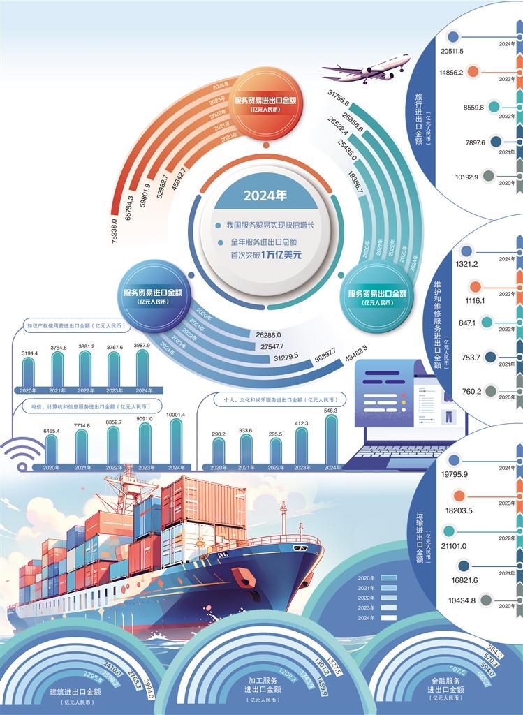 商務(wù)部數(shù)據(jù)顯示,2024年我國(guó)服務(wù)進(jìn)出口總額達(dá)7.5萬(wàn)億元人民幣,同比增長(zhǎng)14.4%,服務(wù)貿(mào)易規(guī)模首次突破1萬(wàn)億美元,再創(chuàng)歷史新高。我國(guó)服務(wù)貿(mào)易實(shí)現(xiàn)了令人矚目的快速增長(zhǎng),展示了經(jīng)濟(jì)發(fā)展的活力和韌性,背后是多個(gè)領(lǐng)域的協(xié)同發(fā)力。