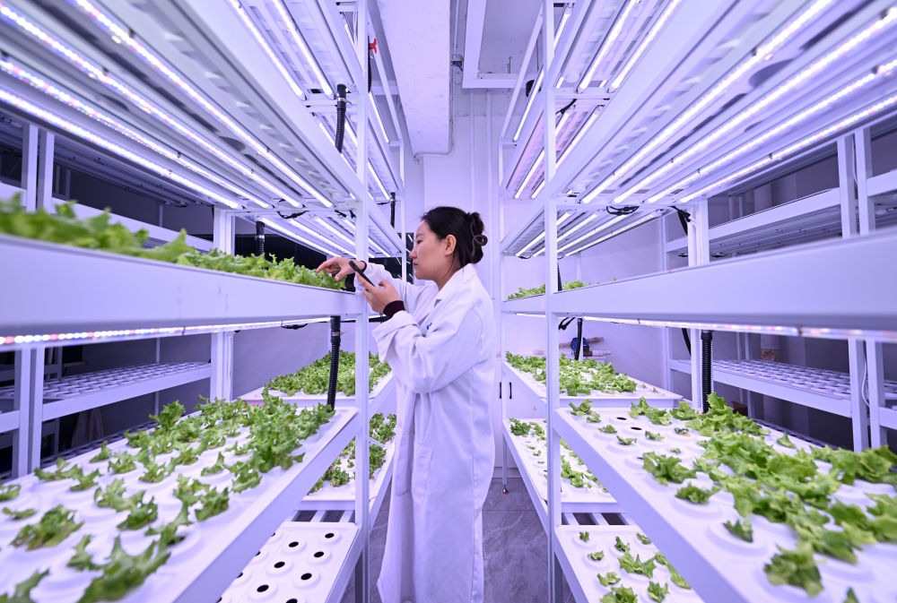 科芯(天津)生態(tài)農(nóng)業(yè)科技有限公司工作人員在實驗室查看農(nóng)作物生長情況。 新華社記者 趙子碩 攝