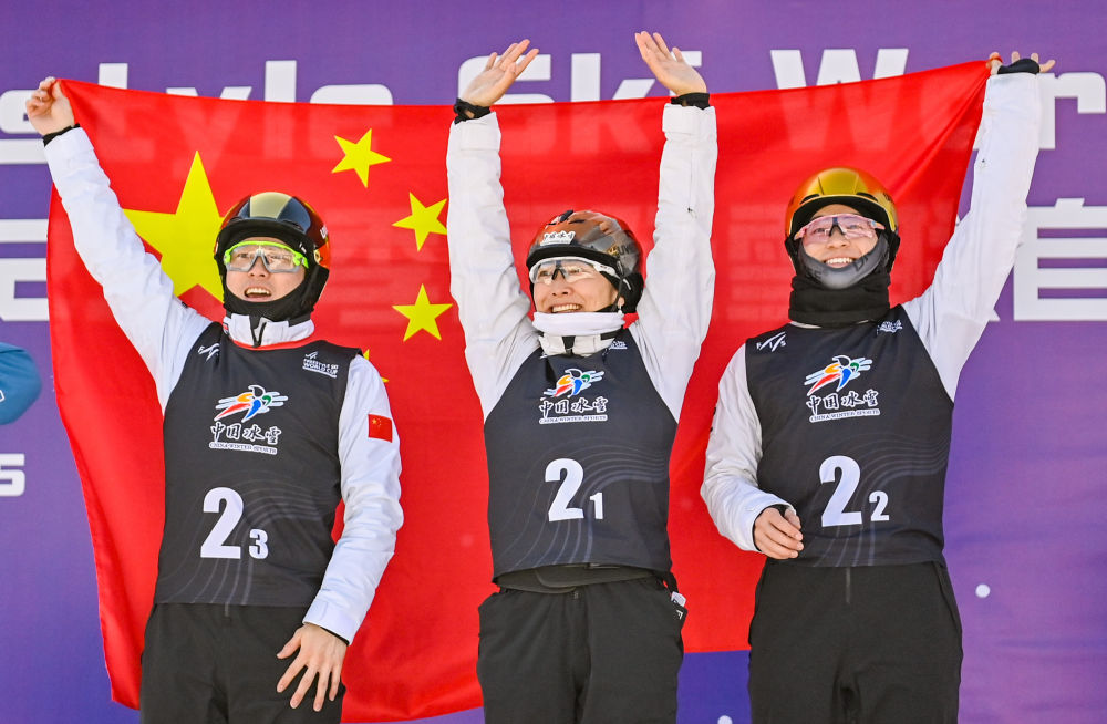 2月24日,在2024-2025賽季國際雪聯(lián)自由式滑雪世界杯(北大湖站)空中技巧混合團(tuán)體決賽中,由徐夢桃、李天馬、齊廣璞組成的中國一隊(duì)獲得金牌。圖為中國一隊(duì)徐夢桃(中)、李天馬(右)、齊廣璞在頒獎儀式上。新華社記者 顏麟蘊(yùn) 攝