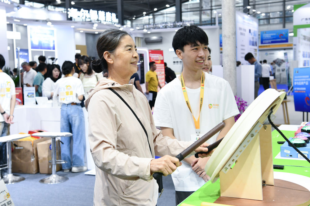 2024年10月27日,老人在2024深圳國際智慧養(yǎng)老產(chǎn)業(yè)博覽會(huì)上體驗(yàn)樂齡鼓。新華社記者 梁旭 攝