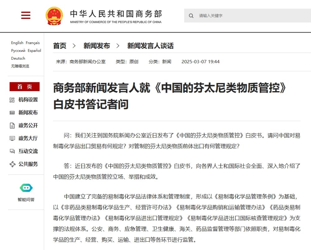問:我們關(guān)注到國務(wù)院新聞辦公室近日發(fā)布了《中國的芬太尼類物質(zhì)管控》白皮書。請問中國對易制毒化學(xué)品出口貿(mào)易有何規(guī)定?對管制的芬太尼類物質(zhì)前體出口有何管理規(guī)定?
