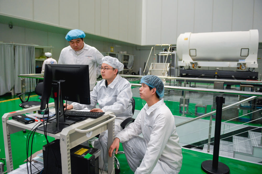 在長光衛(wèi)星相機裝調(diào)間,王升(右二)在調(diào)試衛(wèi)星光學(xué)遙感載荷組件時與團(tuán)隊成員討論細(xì)節(jié)。