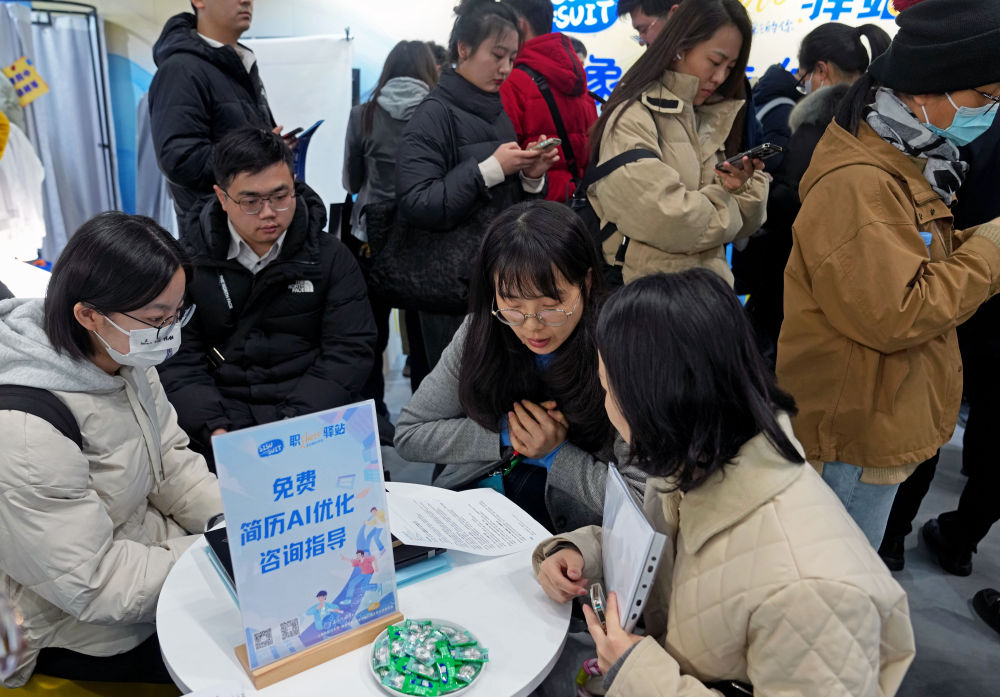 在上海一個大型招聘會現(xiàn)場,工作室團(tuán)隊為求職者進(jìn)行簡歷優(yōu)化指導(dǎo)。