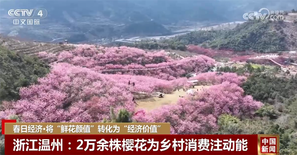 浙江省永嘉縣的溫州櫻花園占地3600畝,已開發(fā)利用1700多畝,種植了2萬余株櫻花,品種涵蓋臺灣牡丹櫻、紅粉佳人櫻等數(shù)十個品種。盛開的櫻花吸引了游客,也帶動了當(dāng)?shù)夭惋嫛⒆∷?、旅游、交通等服?wù)消費(fèi)快速增長,自2月13日開園以來,櫻花園日均接待游客近3000人次,周末更是突破1萬多人。