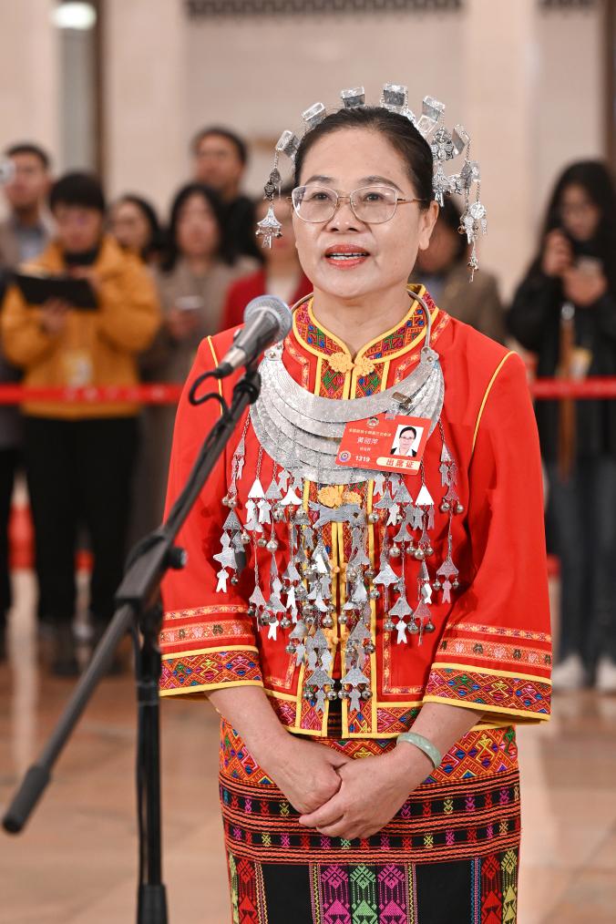 3月10日,全國政協(xié)十四屆三次會議第三場“委員通道”集體采訪活動在北京人民大會堂舉行。這是全國政協(xié)委員黃麗萍接受媒體采訪。新華社記者 金良快 攝