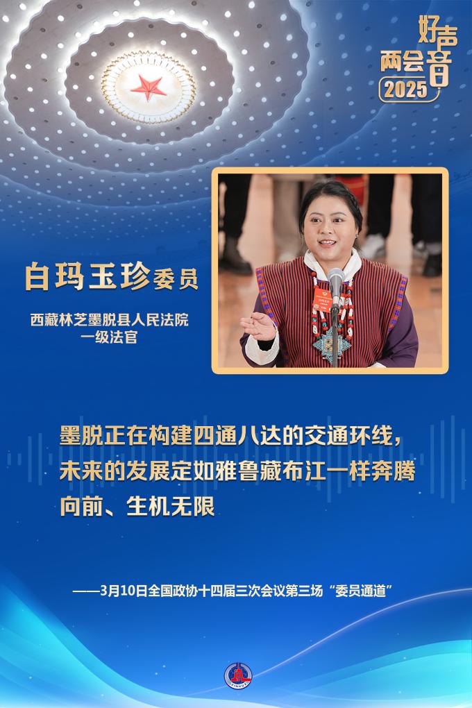 白瑪玉珍委員來自全國最后一個通公路的縣——西藏墨脫。她說,墨脫實(shí)現(xiàn)了從“高原孤島”向“美麗邊城”的時代蛻變,家家戶戶用上了干凈水、穩(wěn)定電、高速網(wǎng),老百姓吃上了“生態(tài)旅游飯”,增收的路子越來越寬。