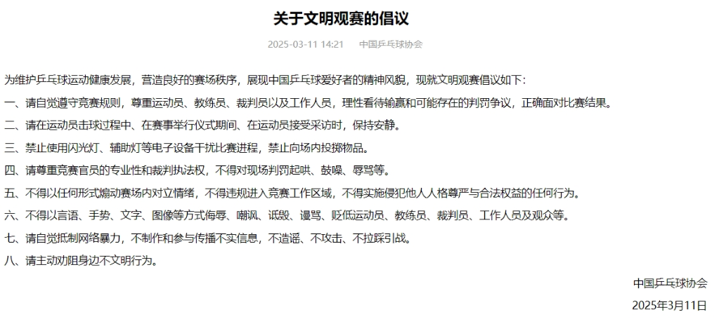 中國乒協(xié)表示,為維護(hù)乒乓球運(yùn)動(dòng)健康發(fā)展,營造良好的賽場(chǎng)秩序,展現(xiàn)中國乒乓球愛好者的精神風(fēng)貌,特提出文明觀賽的倡議。
