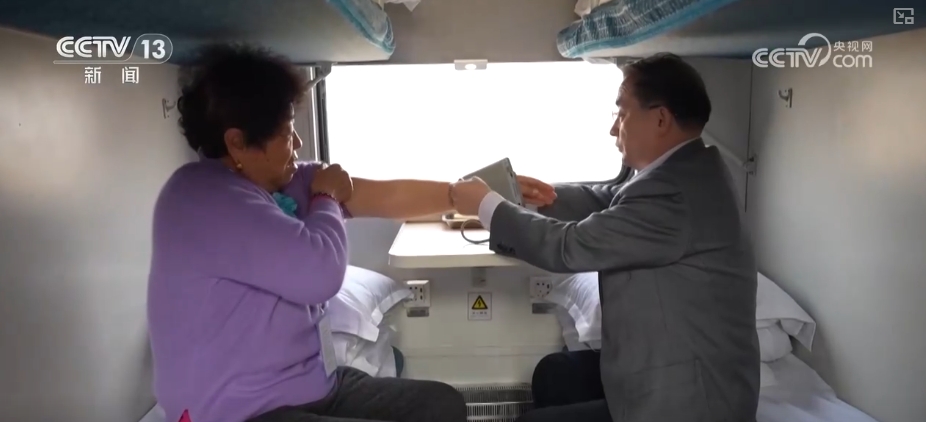 除了為重點(diǎn)老年旅客配備緊急呼叫定位器,銀發(fā)專列上還引入了適老化的AI智能旅行監(jiān)護(hù)設(shè)備,并安排兩名專業(yè)醫(yī)生全程車廂巡診,隨時(shí)為老年人提供健康管理服務(wù)。