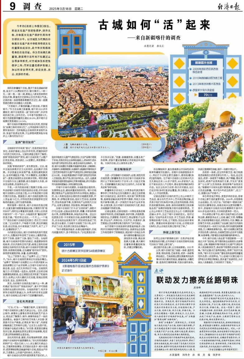 今年的《政府工作報告》提出,推進文化遺產(chǎn)系統(tǒng)性保護,提升文物、非物質文化遺產(chǎn)保護利用和考古研究水平。以古城區(qū)為代表的非物質文化遺產(chǎn)是中華優(yōu)秀傳統(tǒng)文化的重要組成部分,是中華文明綿延傳承的生動見證。作為古絲綢之路重鎮(zhèn),新疆喀什近年來不僅通過立法等多種形式,對古城加強系統(tǒng)性保護工作;同時注重在保護基礎上加以科學合理利用,建設宜居、宜業(yè)、宜游的古城。