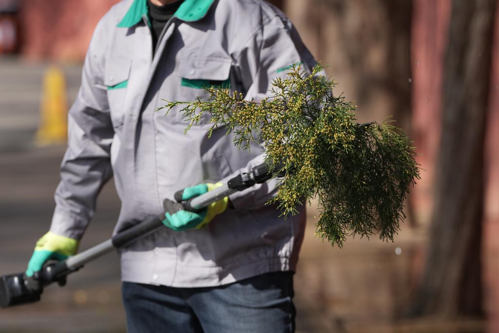 3月19日,北京園林工作人員對開花較多的圓柏枝條進(jìn)行修剪。新華社記者 鞠煥宗 攝
