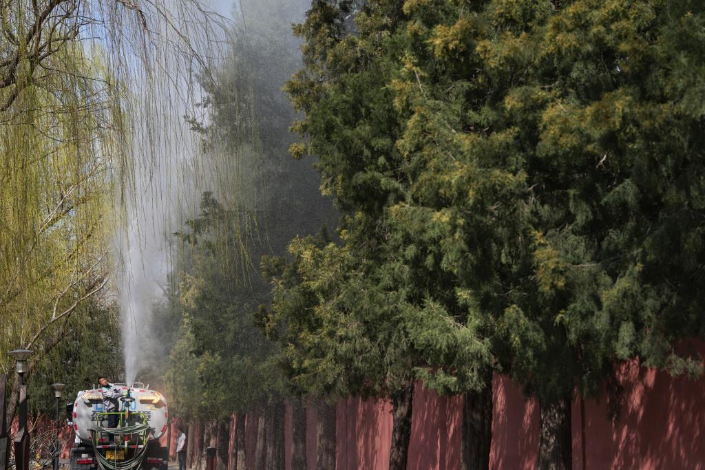 3月19日,北京園林工作人員操作高壓水槍,對圓柏進(jìn)行沖淋。新華社記者 鞠煥宗 攝