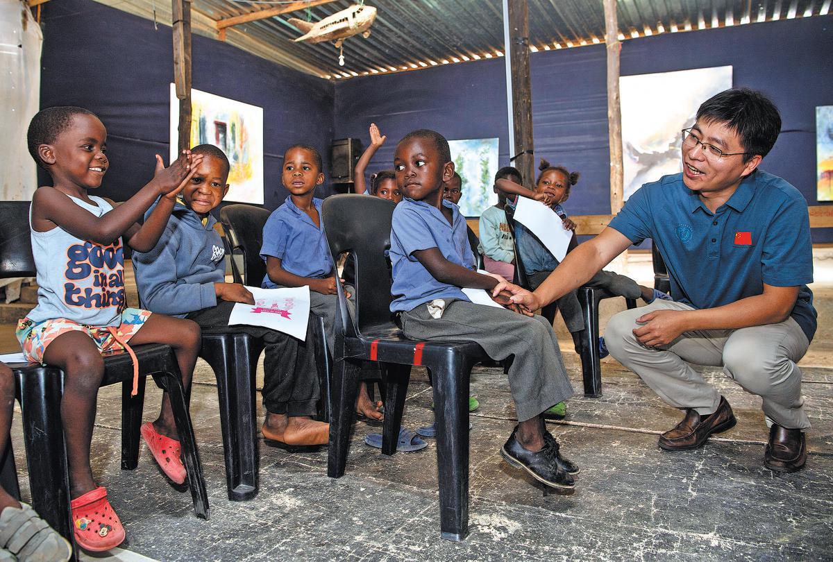 在納米比亞溫得和克的弗朗斯·南賓加藝術培訓中心,一名中國醫(yī)療隊隊員向孩子們講解正確的洗手方法。(圖片/新華社)
