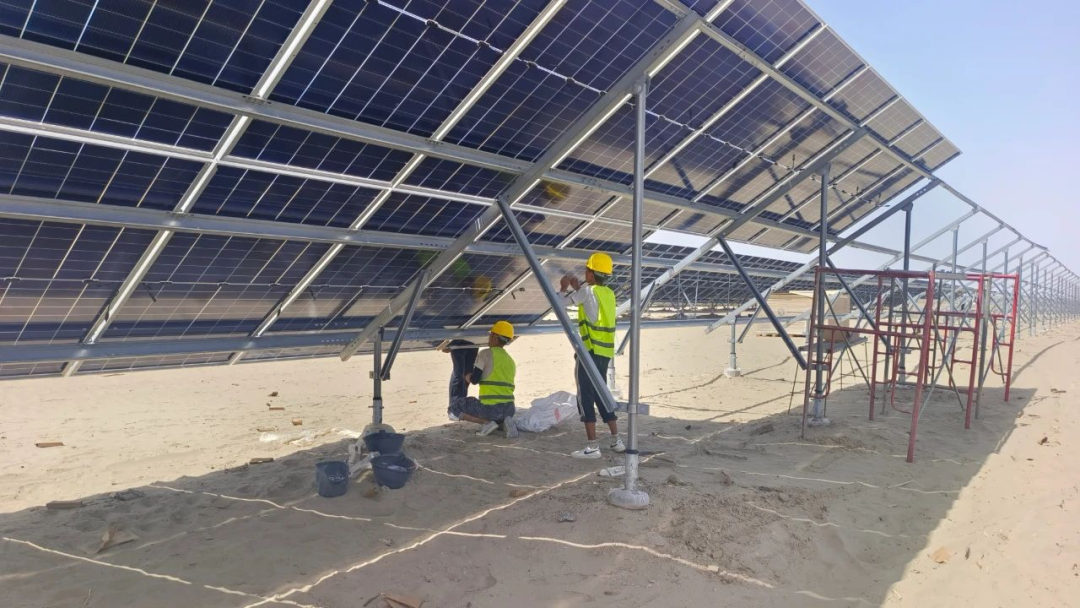 3月28日,在中國電建集團(tuán)新疆分公司新能源公司沙雅縣25萬千瓦光伏項(xiàng)目施工現(xiàn)場,工人們正緊張地安裝光伏板,周圍草方格的鋪設(shè)及梭梭的栽種也在同步開展當(dāng)中。該項(xiàng)目施工負(fù)責(zé)人郝澤權(quán)說,光伏發(fā)電助力機(jī)電井抽取沙漠地表百米以下的微咸水灌溉梭梭林,解決了長期以來沙漠植綠缺水難題,實(shí)現(xiàn)生態(tài)與經(jīng)濟(jì)的雙重收益。