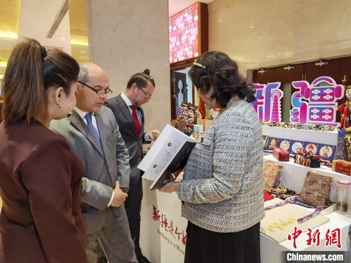 3月31日,新疆在北京舉辦有關國家駐華使節(jié)交流會,來自43個國家和國際組織的70位外賓出席。圖為外賓在新疆特色產(chǎn)品展區(qū)參觀。 中新社記者 徐雪瑩 攝