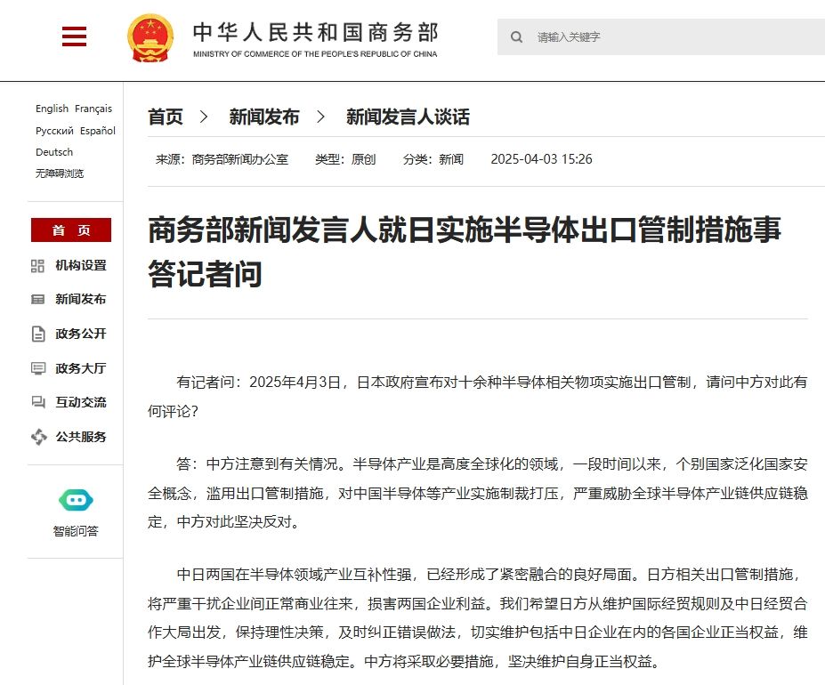 有記者問:2025年4月3日,日本政府宣布對(duì)十余種半導(dǎo)體相關(guān)物項(xiàng)實(shí)施出口管制,請(qǐng)問中方對(duì)此有何評(píng)論?