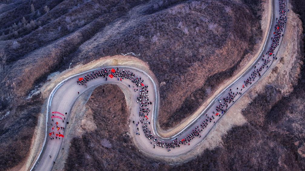 4月3日,參加徒步祭英烈活動的師生在翻越黃峁山(無人機(jī)照片)。