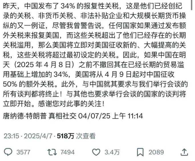 一覺醒來,特朗普再發(fā)威脅,警告中國(guó)在4月8號(hào)前取消報(bào)復(fù),不然4月9號(hào)就對(duì)中國(guó)再加50%額外關(guān)稅,此外所有和中國(guó)的談判都會(huì)中止,而和其他國(guó)家的談判將立即開始。