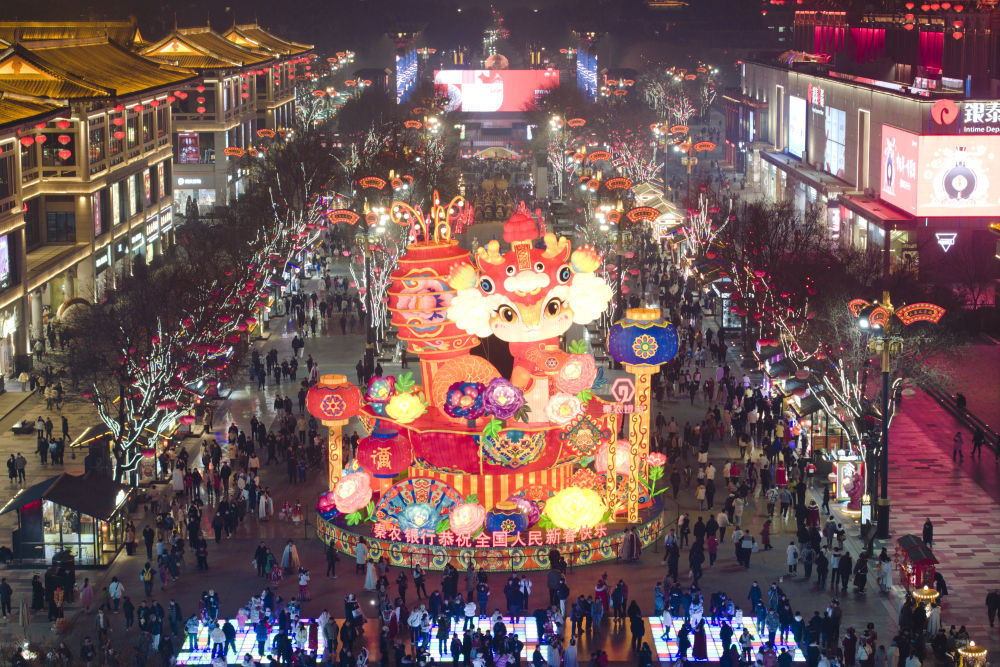 市民游客在西安大唐不夜城游玩、消費(fèi)(1月22日攝,無人機(jī)照片)。新華社記者 邵瑞 攝