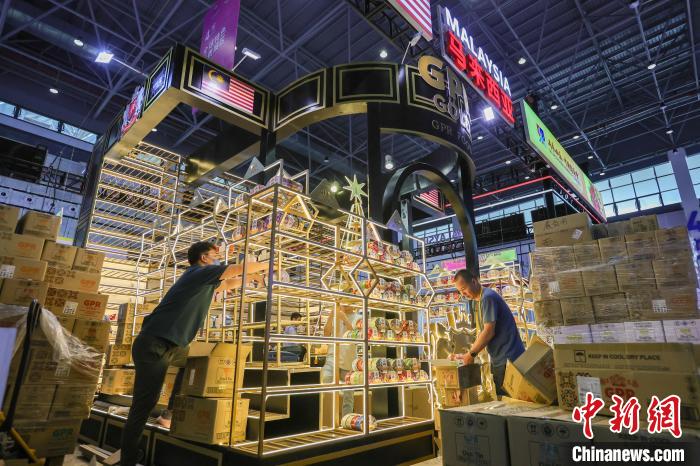 4月11日,第五屆中國國際消費品博覽會即將開展,馬來西亞館的展商在布置展品。中新社記者 駱云飛 攝