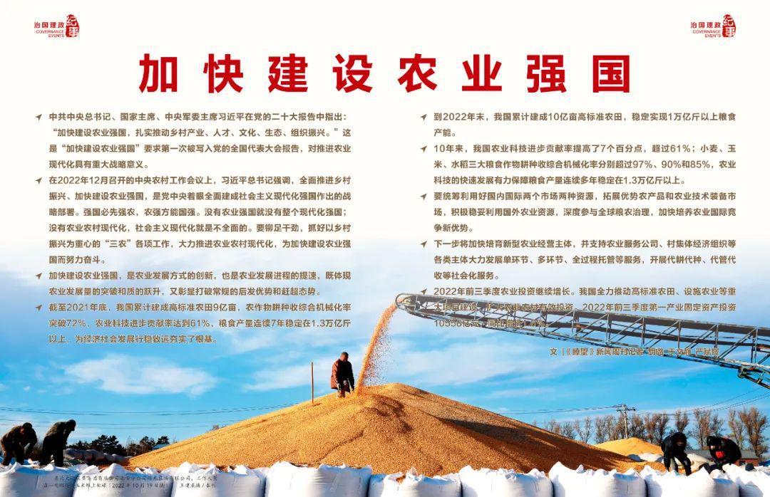 ◆ 中共中央總書記、國家主席、中央軍委主席習(xí)近平在黨的二十大報告中指出:“加快建設(shè)農(nóng)業(yè)強國,扎實推動鄉(xiāng)村產(chǎn)業(yè)、人才、文化、生態(tài)、組織振興?!边@是“加快建設(shè)農(nóng)業(yè)強國”要求第一次被寫入黨的全國代表大會報告,對推進農(nóng)業(yè)現(xiàn)代化具有重大戰(zhàn)略意義。