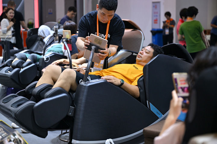 2024年4月17日,參觀者在第四屆消博會(huì)上體驗(yàn)傲勝按摩椅。新華社記者 郭程 攝