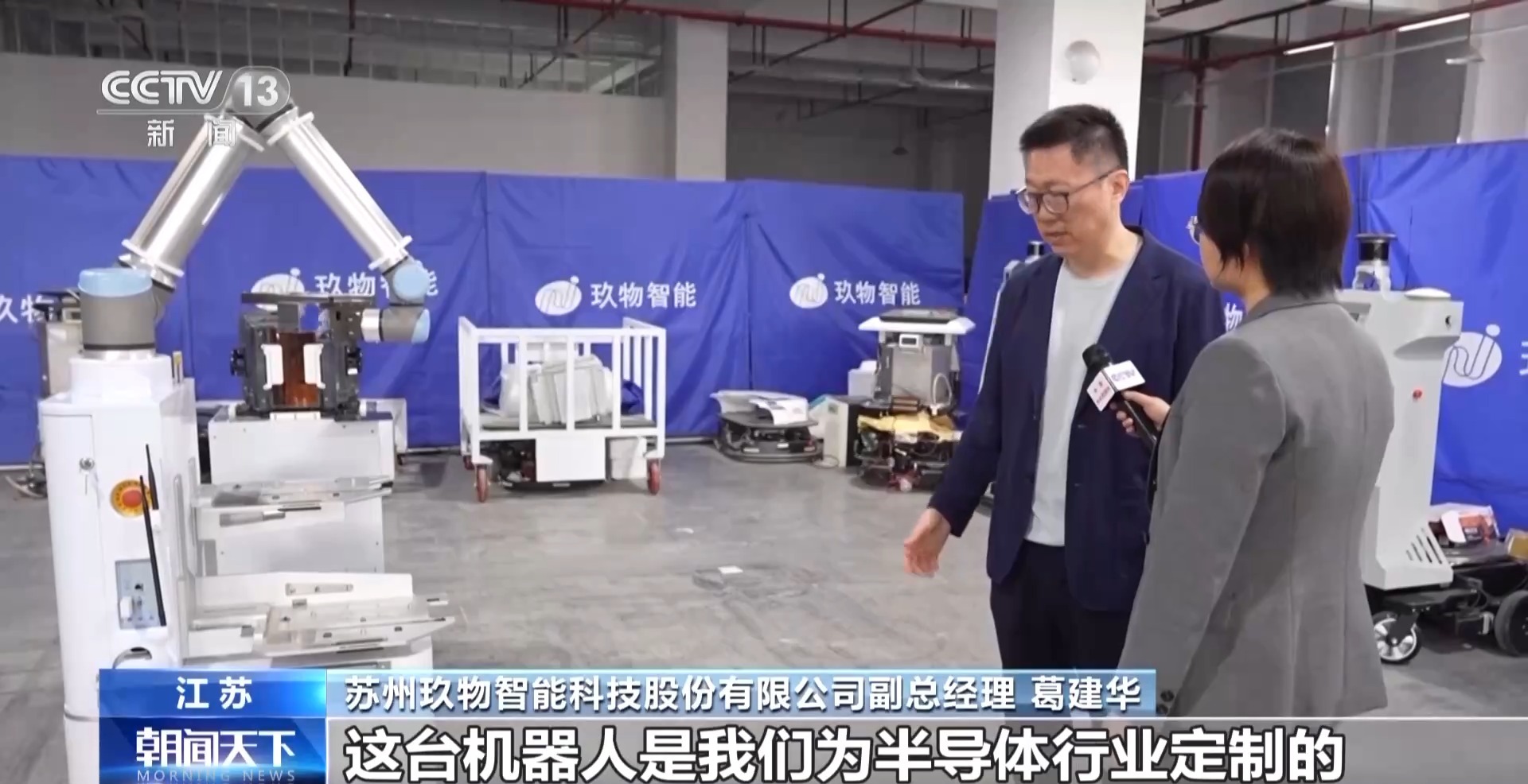蘇州玖物智能科技股份有限公司副總經(jīng)理 葛建華:這臺(tái)機(jī)器人是我們?yōu)榘雽?dǎo)體行業(yè)定制的。我們現(xiàn)在抓取的這個(gè)設(shè)備,其實(shí)是一臺(tái)晶圓盒,這個(gè)晶圓片模型其實(shí)特別薄、特別脆,震動(dòng)稍微厲害一點(diǎn)就會(huì)有裂痕,機(jī)械臂的精度可以達(dá)到0.1毫米。