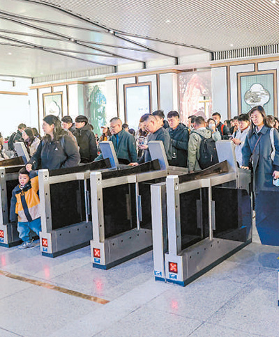 近日,“水韻江蘇”主題旅游列車首發(fā),開啟了春天環(huán)游江蘇的序幕。該旅游列車分A、B線,A線由南通站至上海虹橋站往返,B線由上海站至徐州東站往返。圖為在揚(yáng)州東站,游客檢票乘坐“水韻江蘇”旅游列車。任 飛攝(人民視覺)