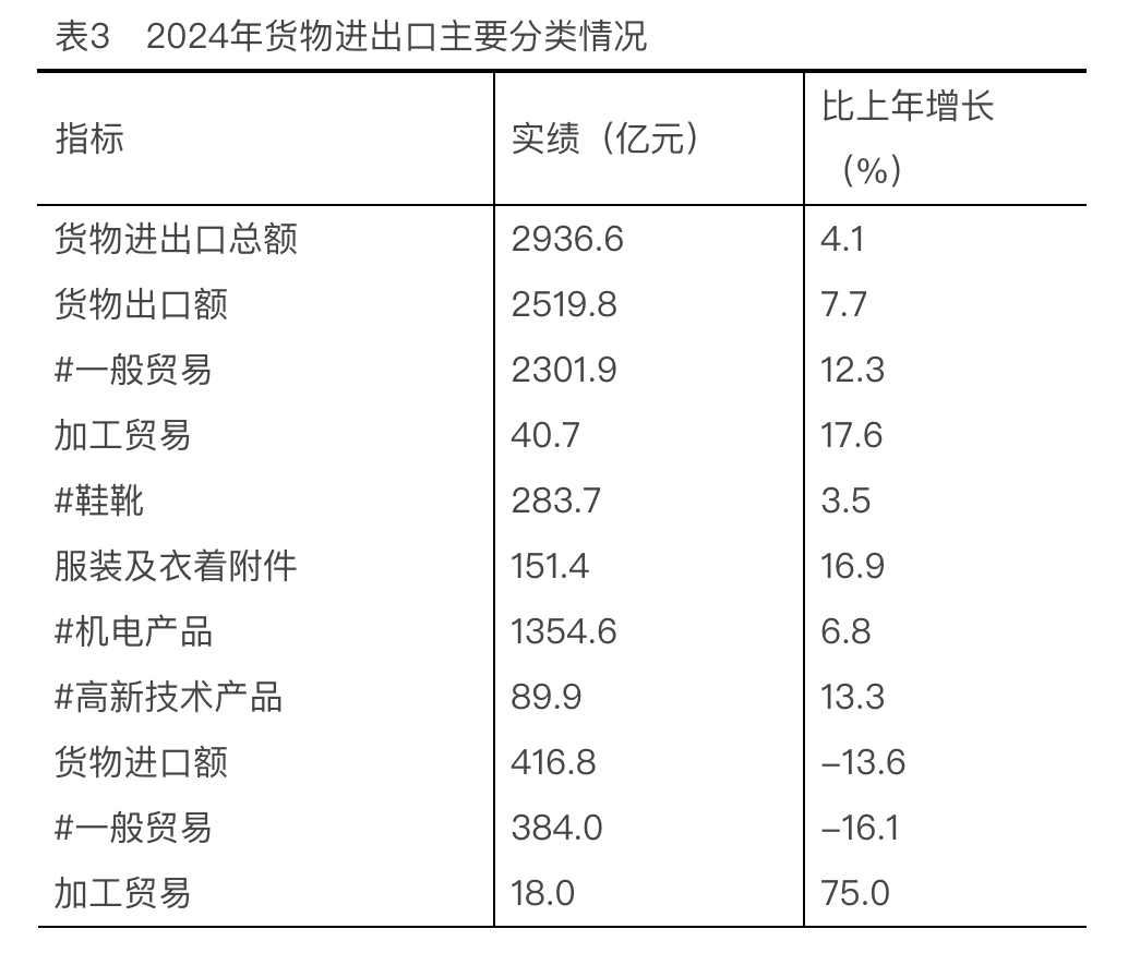 2024年,溫州全年貨物進出口總額2936.6億元,比上年增長4.1%,其中出口2519.8億元,主要涉及鞋、服、機電產(chǎn)品等領(lǐng)域。貿(mào)易空間持續(xù)拓展,對共建“一帶一路”國家、東盟、拉丁美洲出口額分別比上年增長6.8%、16.3%、12.6%。