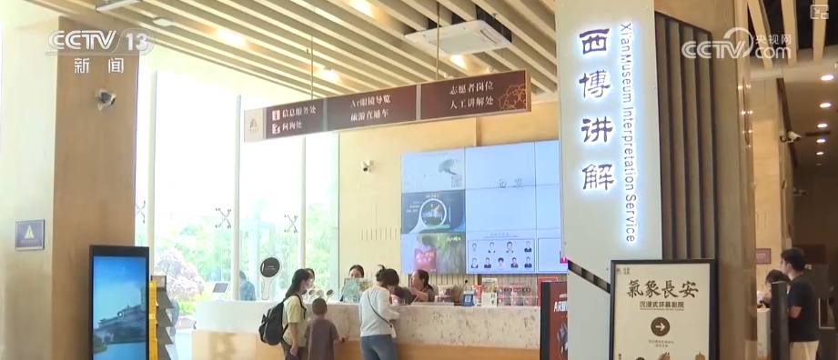 西安博物院公共服務(wù)部工作人員楊蕊伊介紹,“五一”期間,票務(wù)、安保、保潔人員增加了班次,同時也增設(shè)了大量的值班人員。在講解方面,講解人員、志愿者人員都增加了人數(shù),同時也增加了講解班次。他們在西門、北門都設(shè)有游客服務(wù)中心,為廣大游客提供便利服務(wù)。針對于國際游客,他們有英文版的自助導(dǎo)覽機提供服務(wù)。