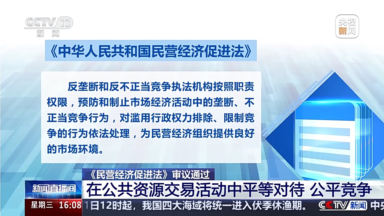 全國(guó)人大常委會(huì)法工委經(jīng)濟(jì)法室主任 楊合慶:制定民營(yíng)經(jīng)濟(jì)促進(jìn)法,第一次將“毫不動(dòng)搖鞏固和發(fā)展公有制經(jīng)濟(jì),毫不動(dòng)搖鼓勵(lì)、支持、引導(dǎo)非公有制經(jīng)濟(jì)發(fā)展”“促進(jìn)民營(yíng)經(jīng)濟(jì)健康發(fā)展和民營(yíng)經(jīng)濟(jì)人士健康成長(zhǎng)”寫(xiě)入法律,第一次明確民營(yíng)經(jīng)濟(jì)的法律地位,第一次明確規(guī)定促進(jìn)民營(yíng)經(jīng)濟(jì)持續(xù)、健康、高質(zhì)量發(fā)展,是國(guó)家長(zhǎng)期堅(jiān)持的重大方針政策。