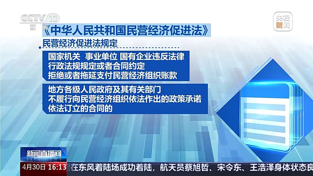 另外,民營(yíng)經(jīng)濟(jì)促進(jìn)法規(guī)定,國(guó)家機(jī)關(guān)、事業(yè)單位、國(guó)有企業(yè)違反法律、行政法規(guī)規(guī)定或者合同約定,拒絕或者拖延支付民營(yíng)經(jīng)濟(jì)組織賬款,地方各級(jí)人民政府及其有關(guān)部門(mén)不履行向民營(yíng)經(jīng)濟(jì)組織依法作出的政策承諾、依法訂立的合同的,由有權(quán)機(jī)關(guān)予以糾正,造成損失的,依法予以賠償;造成不良后果或者影響的,對(duì)負(fù)有責(zé)任的領(lǐng)導(dǎo)人員和直接責(zé)任人員依法給予處分。