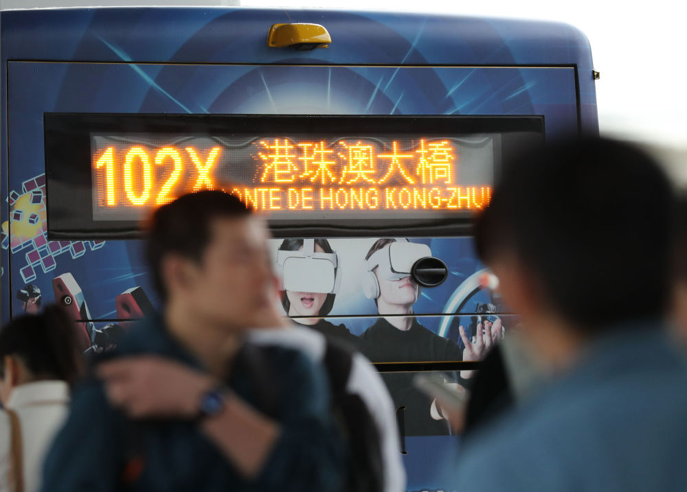 市民和旅客在橫琴口岸澳門口岸區(qū)排隊(duì),準(zhǔn)備登上前往港珠澳大橋方向的公交車。新華社記者 王益亮 攝