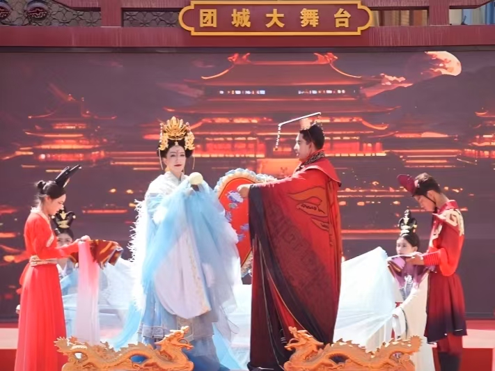 這是5月1日和田團(tuán)城開城儀式上沉浸式舞劇《西巡傳說》的演出現(xiàn)場。