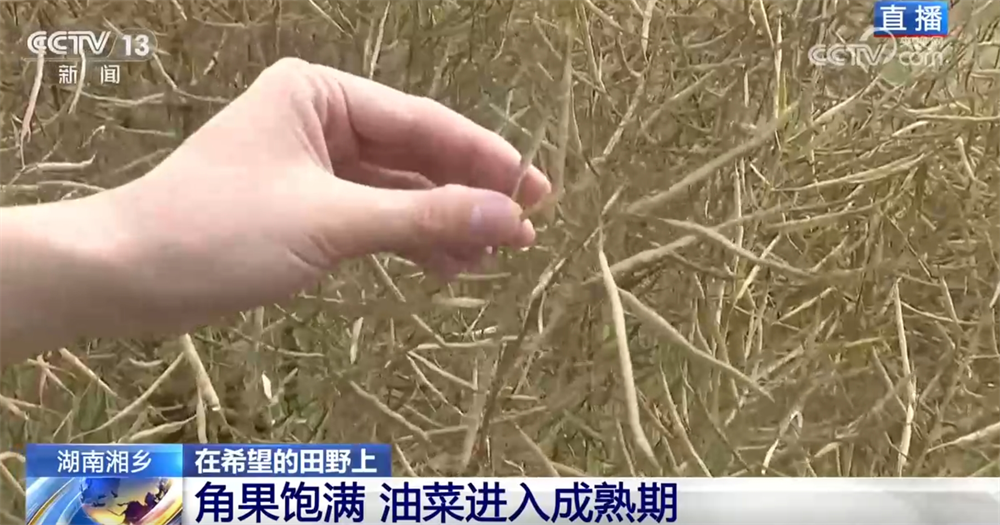 記者來到了湘潭湘鄉(xiāng)市泉塘鎮(zhèn)雙江村,油菜現(xiàn)在長得怎么樣了?油菜的頂端已經(jīng)呈金黃色,角果很飽滿,我們平時常說的油菜籽就藏在金黃色的角果里,這說明現(xiàn)在油菜已經(jīng)進(jìn)入成熟期了。