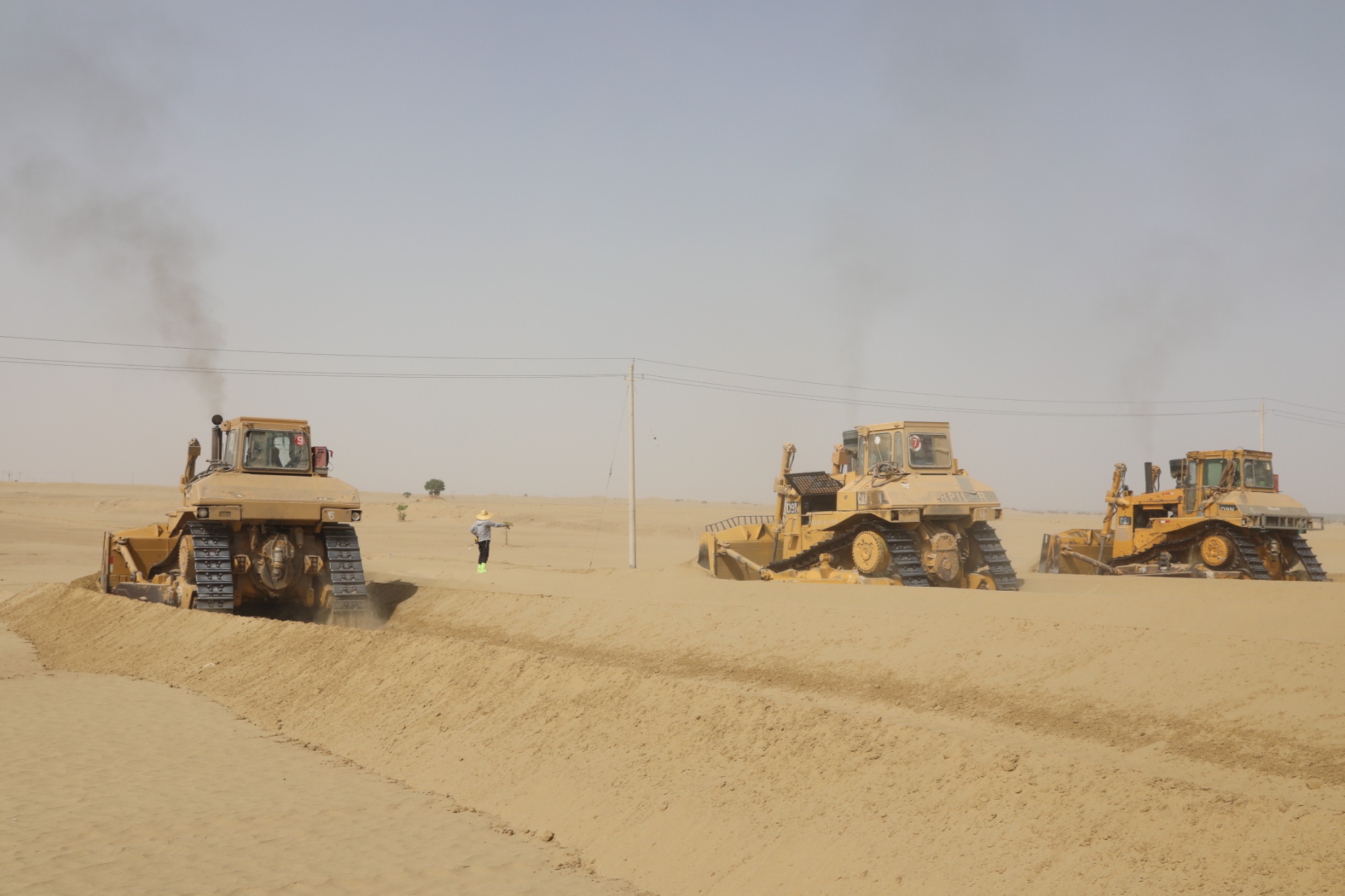 防沙治沙項目現(xiàn)場,大型機(jī)械正在平整沙漠 (日孜完古麗·買吐地 攝)