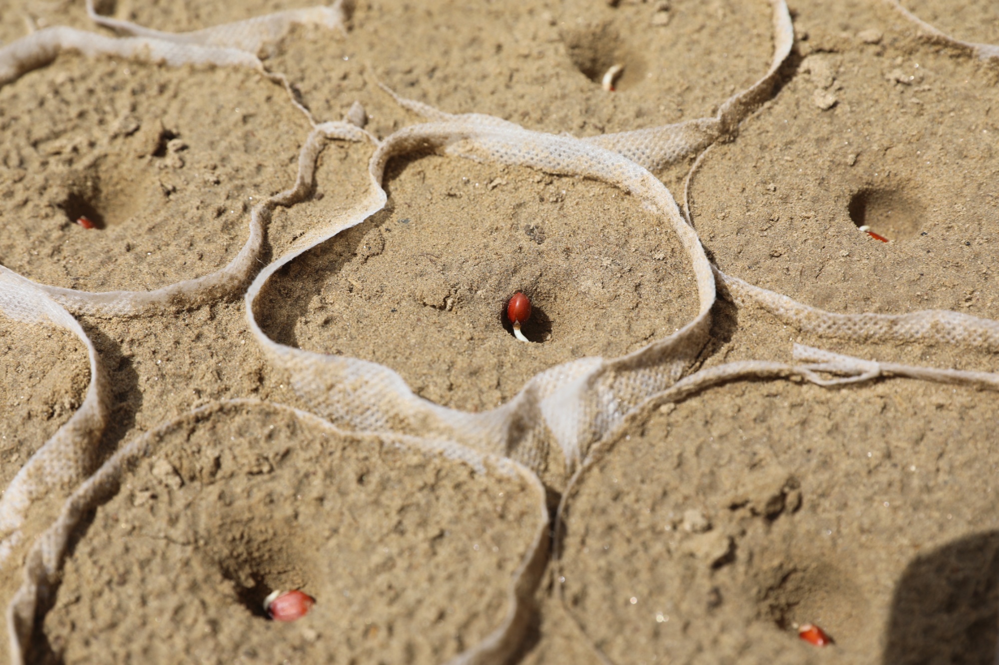 播種前,土地經(jīng)過改良,混合化肥與羊糞的有機(jī)肥料被均勻撒入沙土,再裝入育苗袋。在育苗袋里播種后,工作人員澆水、埋土、覆膜、搭建拱棚,確保幼苗在防風(fēng)保溫的環(huán)境中茁壯成長。