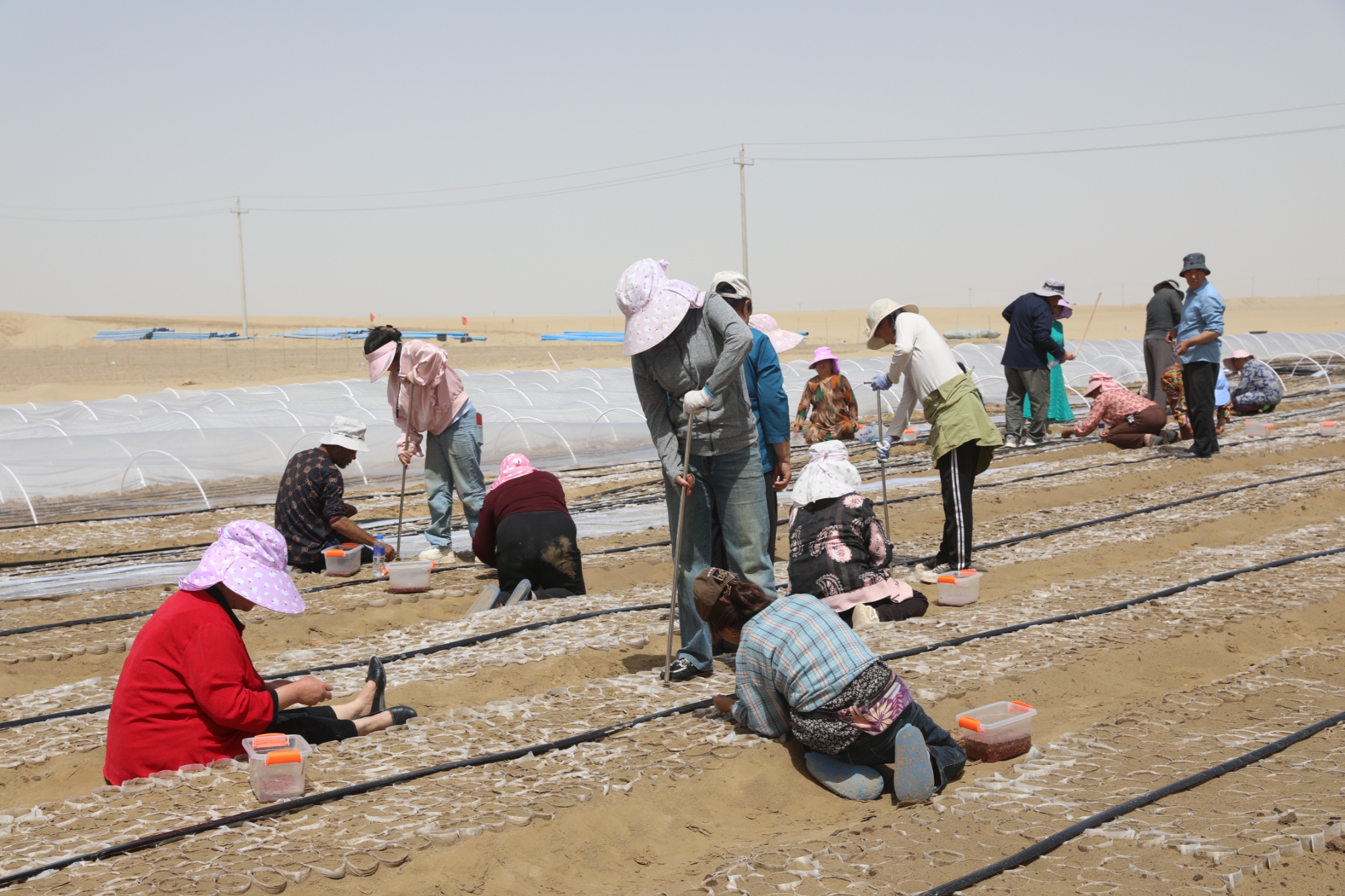 近日,在喀瓦克鄉(xiāng)墩庫勒村的防沙治沙項目現(xiàn)場,推土機(jī)平整后的沙地連綿成片,工作人員正緊張有序地進(jìn)行灰棗育苗工作。