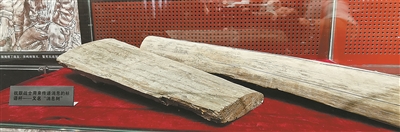 展柜中看似普通的兩塊木頭,實(shí)為文物“消息樹”。樹皮上,“中國報(bào)”等字跡仍能辨認(rèn)。