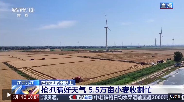 位于江西省九江市柴桑區(qū)的江洲鎮(zhèn)今年種植小麥5.5萬畝,占九江市小麥種植面積的三分之一。眼下那里的小麥已經(jīng)成熟,為了搶抓晴好天氣,當(dāng)?shù)胤e極組織機械收割。