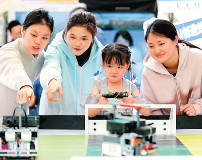 4月28日,在福建省福州市鼓樓區(qū)鼓東街道冶山春秋園,小朋友正在體驗足球機器人。謝貴明攝(人民視覺)
