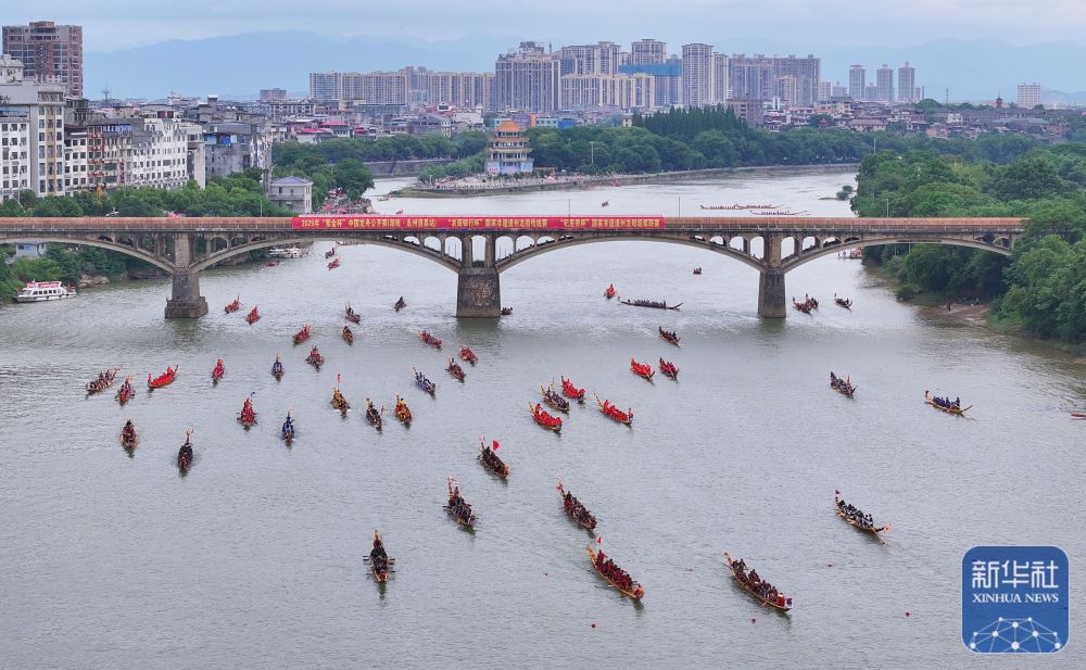 5月22日,龍船在湖南省永州市道縣縣城瀟水河面劃行備戰(zhàn)(無人機(jī)照片)。新華社發(fā)(何紅福攝)