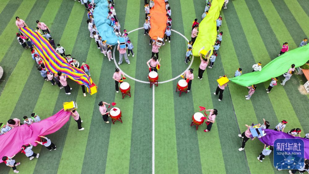 5月23日,在山東省東營市廣饒縣李鵲鎮(zhèn)中心幼兒園,小朋友在進(jìn)行龍舟賽游戲(無人機(jī)照片)。新華社發(fā)(劉云杰攝)